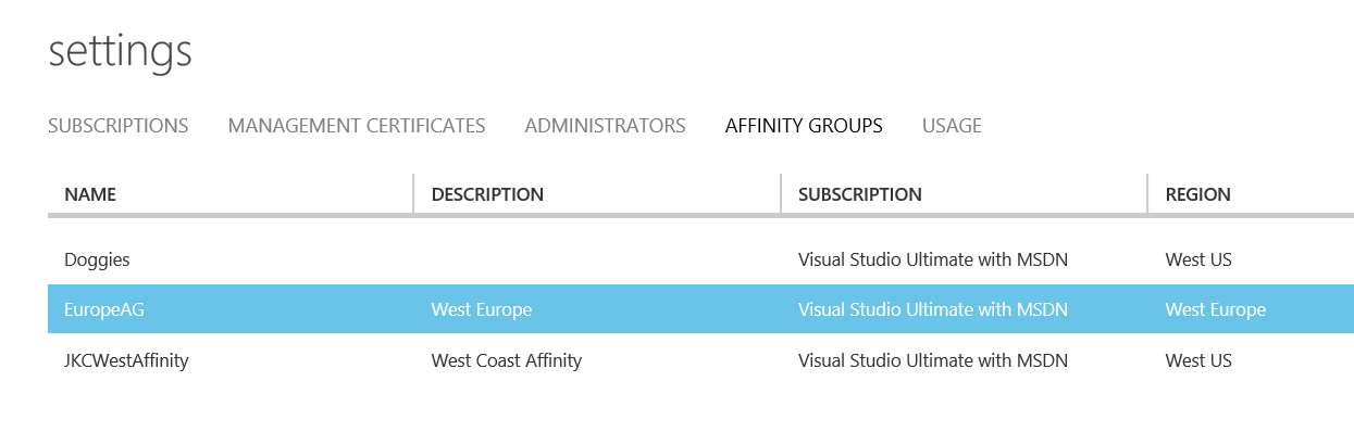 To create an affinity group, you provide a name and create a network that is associated with it. Then all the VMs added to that affinity group also will be given addressing from the associated virtual network. Affinity groups are created in your Azure settings area.